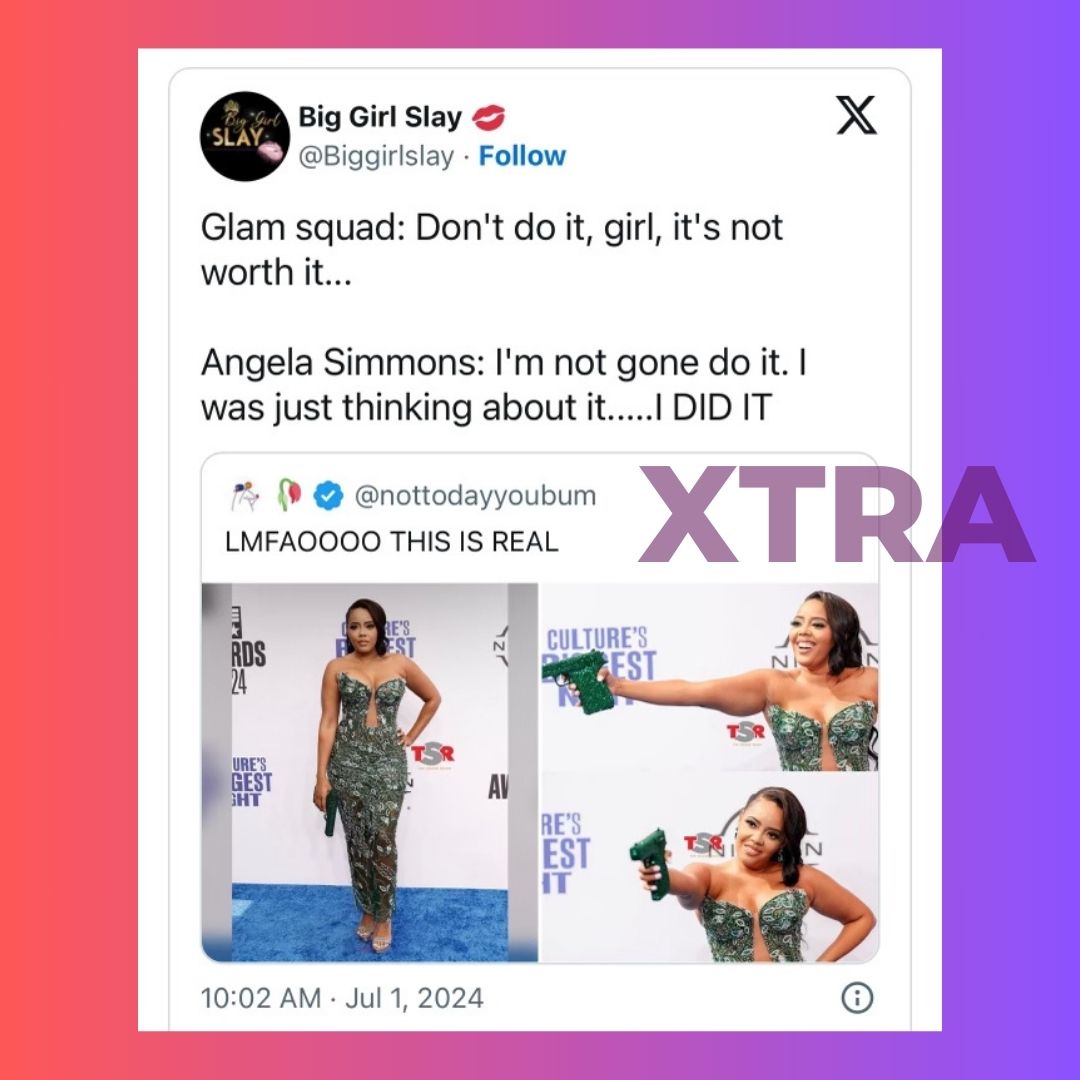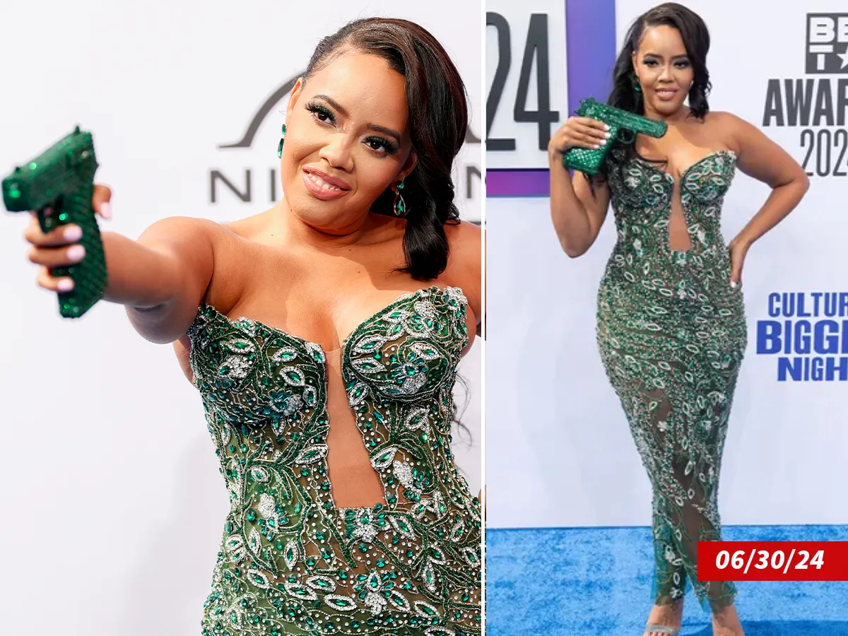 XTRALITES! Social media is fake mad again, but this time they may be right.. Angela Simmons wore a stunning emerald-gemmed gown to the 2024 BET Awards, but the fashion moment was overshadowed by controversy surrounding her choice of accessories. The entrepreneur chose to wear an emerald bedazzled gun clutch to complement her peacock-inspired ensemble and silver shoes. Despite her striking look, social media buzzed with reactions given her own experiences with gun violence, prompting Simmons to address the issue.