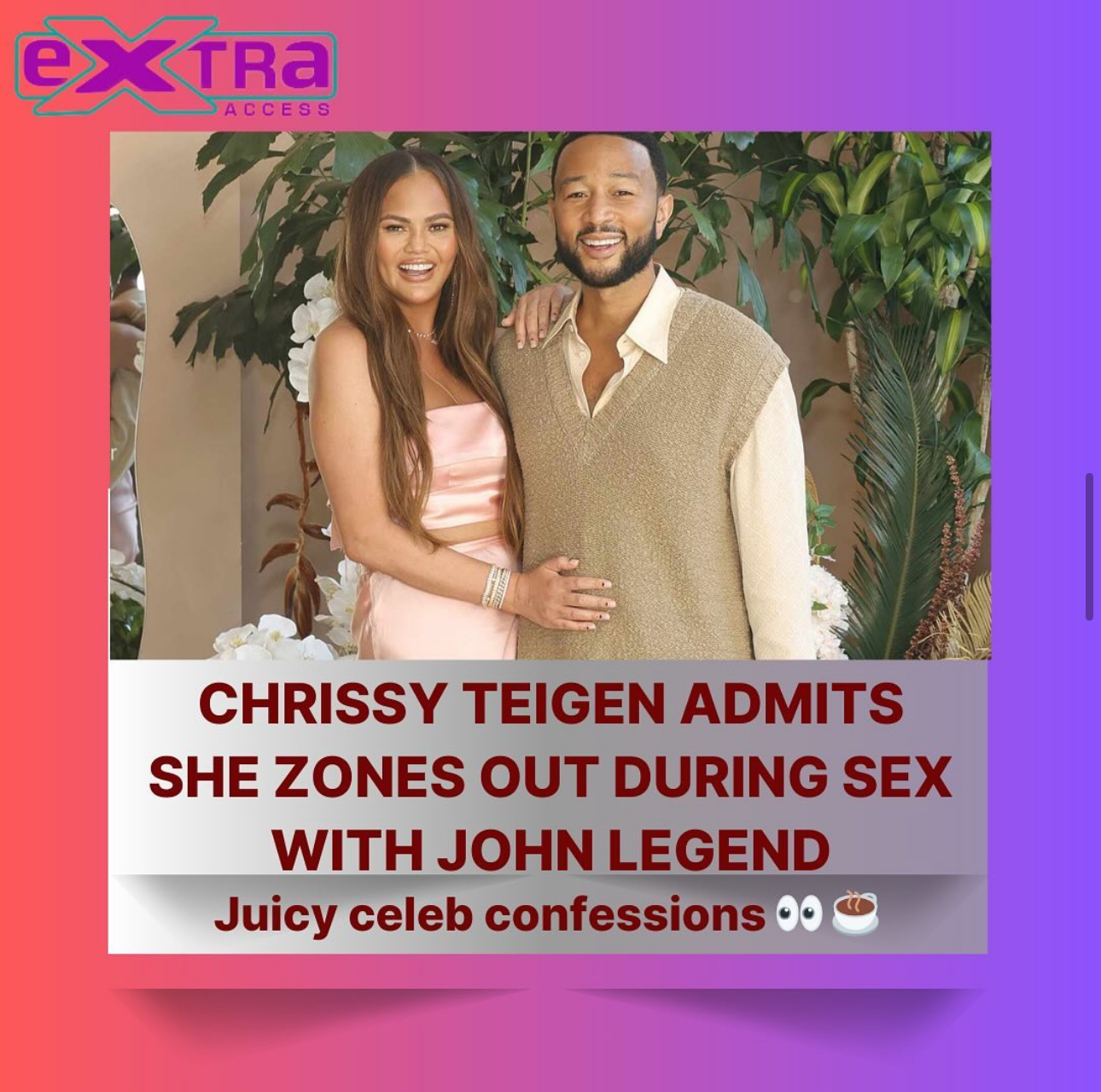 #xtracelebconfessions She’s back! Chrissy shared a recent update on her intimate life with John Legend post-parenting four kids during her January 2024 appearance on The Drew Barrymore Show. The Cravings author humorously confessed to frequently drifting into intrusive thoughts while being intimate and pondering random things. When asked by Drew where her mind goes she quipped, “Anywhere. Is the door locked? Is my spray tan coming off? So much,”.